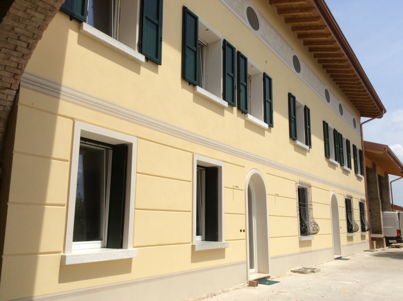 Casa di campagna con fregio e marcapiano dipinti.